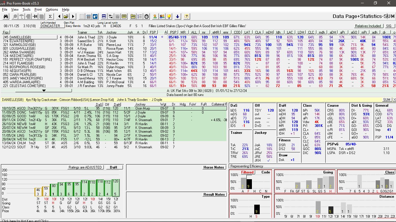 View form and ratings in-a-line, arrayed, semi-close-up and close-up. Ratings include Official handicap, DataForm handicap and DataForm speed. DataForm ratings are compiled with reference to DataForm's unique Weight For Age scales, Pounds Per Length scales, Goings, Going Allowances and Standard Times.